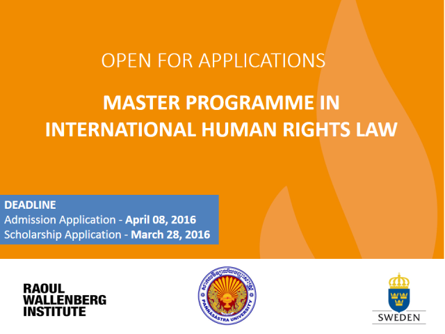 Paññasastra University of Cambodia (PUC) and the Raoul Wallenberg Institute of Human Rights and Humanitarian Law (RWI) with financial support from Swedish Development Cooperation will provide up to 15 full Scholarships and 03 partial Scholarships (50%) for individuals to study the new Master Programme in International Human Rights Law at PUC’s Faculty of Law and Public Affairs. The Master Programme has been jointly developed by PUC and RWI and offers a unique opportunity for committed individuals to obtain an international level postgraduate qualification in international human rights law in Cambodia. Staff at justice sector institutions, government institutions, non-governmental organization, academic institutions and freshly graduated students are likely to find the programme useful. The programme will be conducted in evenings on weekday in order to enable students with full-time employment to attend. Normally, classes will be provided in three sessions per week from Monday to Friday scheduled between 17:30 and 20:30. Scholarships will cover the full tuition fee for the 54 credits Master Programme. The first semester will start on 19 April 2016.