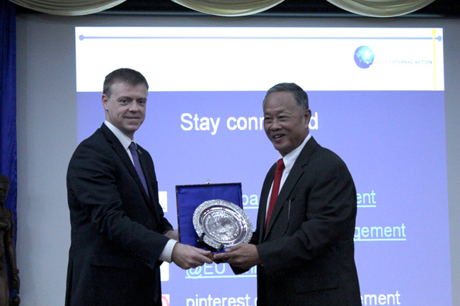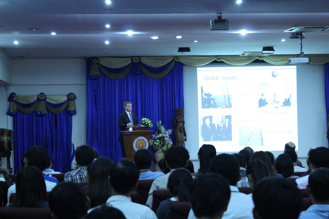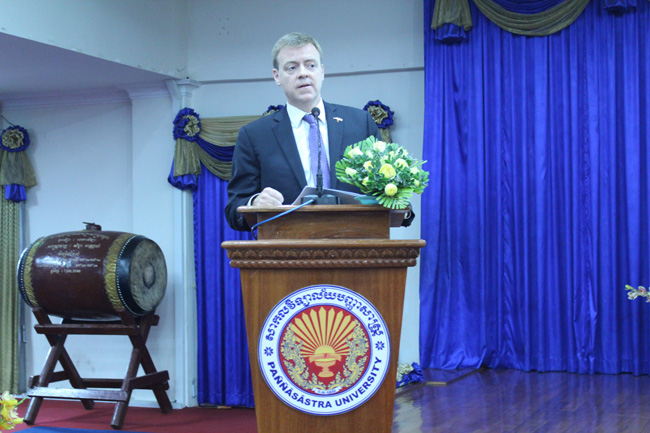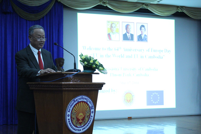 “We are here to learn from you, to listen to your concern and see what the EU can do in order to help reform”. This was the message from H.E. William (Bill) Longhurst, British ambassador to Cambodia during the European Day 64th anniversary at Paññāsāstra University of Cambodia (PUC), South campus.