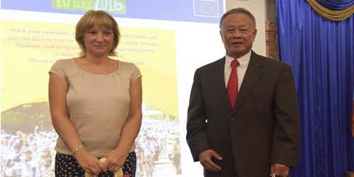 Dr. Sin Meng Srun, Vice president for Academic affairs, warmly welcomed Mrs. Gasparikova. He addressed a bit of the history of the EU in Cambodia and its support in the areas of education, agriculture, and good governance and administration reform.