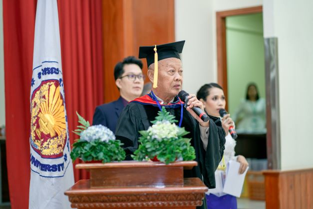 Continuing with our humble vision, playing an active role in the nation-building process for future generations, where non-violent means are used to resolve conflicts, beginning with individuals, societies, governments, and extending to the community of world leaders, I humbly believe that education is the key to fulfilling this vision. As people are well educated, exemplified, and attested by our proud graduates here gathered today, they are empowered to participate in and contribute more fully to the society. Education is, indeed, the foundation for genuine peace, security, and sustainable development for a prosperous nation and a peaceful world.