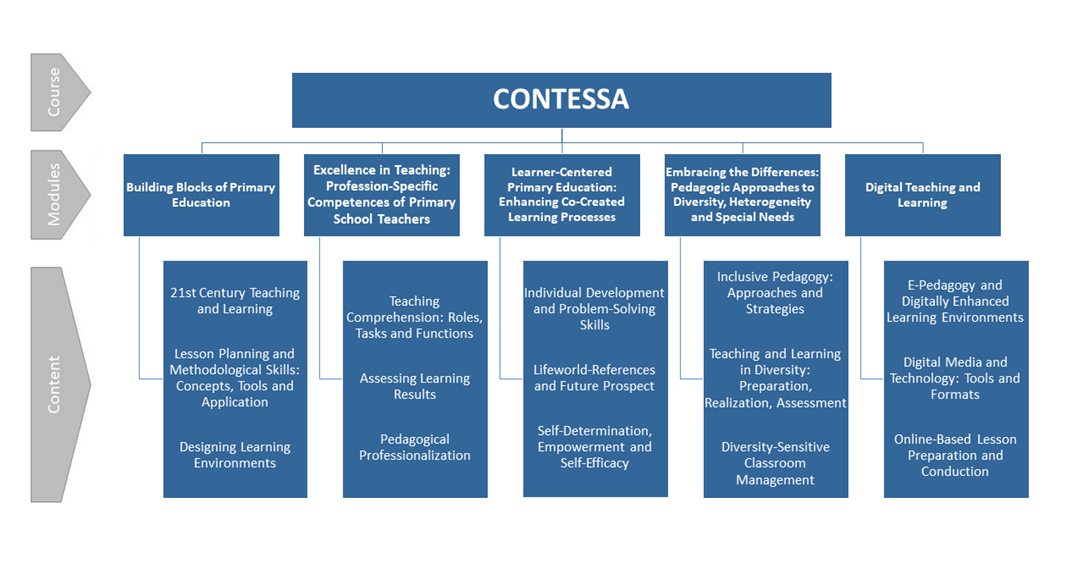 • Name of degree program: Post Graduate Diploma in Education (Primary education specialization). The Professional Post Graduate Diploma in Education (PGDE) is the mandatory professional qualification for the graduate teachers recognized by the Ministry of Education. The recruitment of graduate teachers at the primary level is on the rise. Hence, this PGDE with the primary education specialization will be the first to be offered in the country. The CONTESSA modules will be accompanied by a research report and ten weeks of teaching practice in a primary school.