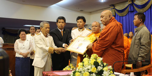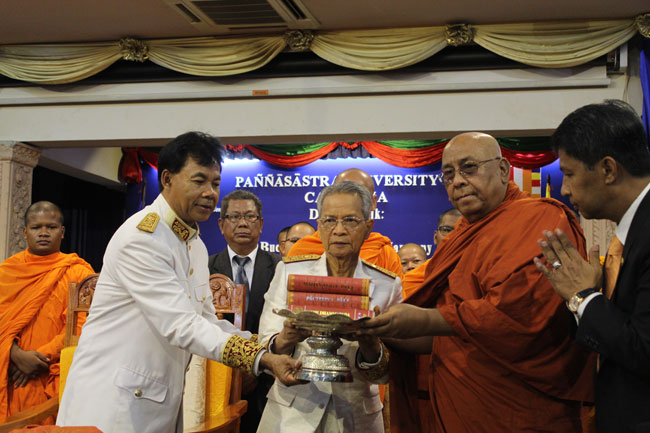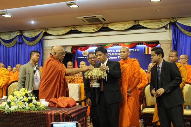 Accompanying Most Venerable Dr. Ashin Nyanissara was Samdech Preah Maha Ariyavamsa Sao Chanthol, Vice Inspector General of Buddhist Education of the Kingdom of Cambodia; H.E. U Cho Htun Aung, Ambassador of the Republic of the Union of Myanmar; H.E Veng Serey Vuth, Chairman of the PUC board of trustees; and Dr. Kol Pheng, PUC president.